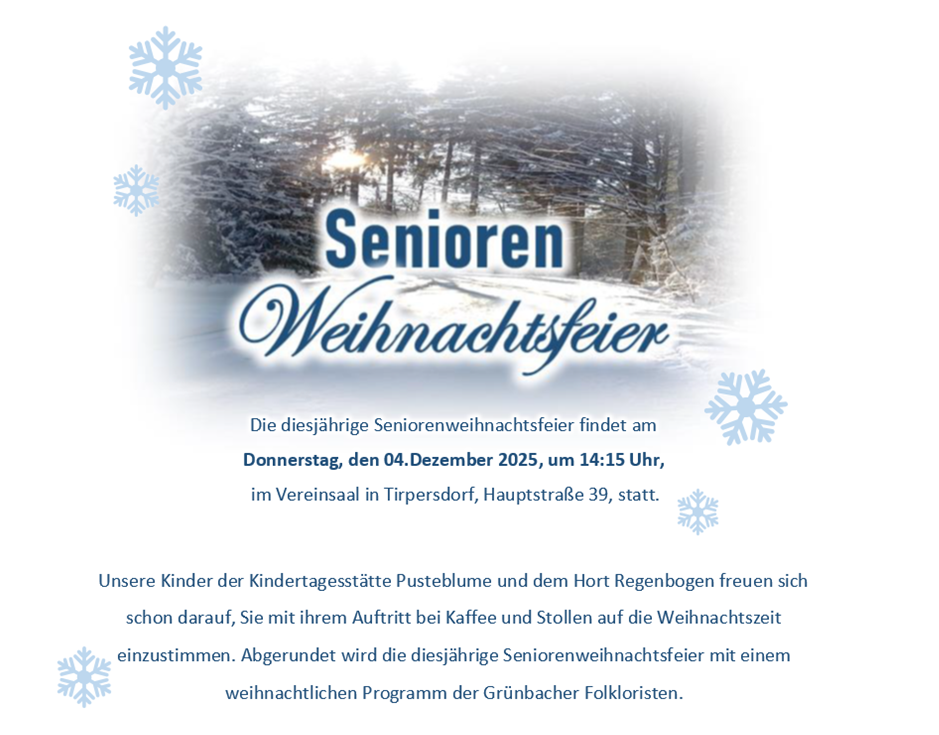 Die diesjährige Seniorenweihnachtsfeier findet am Donnerstag, den 04. Dezember 2025, um 14:15 Uhr, im Vereinssaal in Tirpersdorf, Hauptstraße 39, statt.